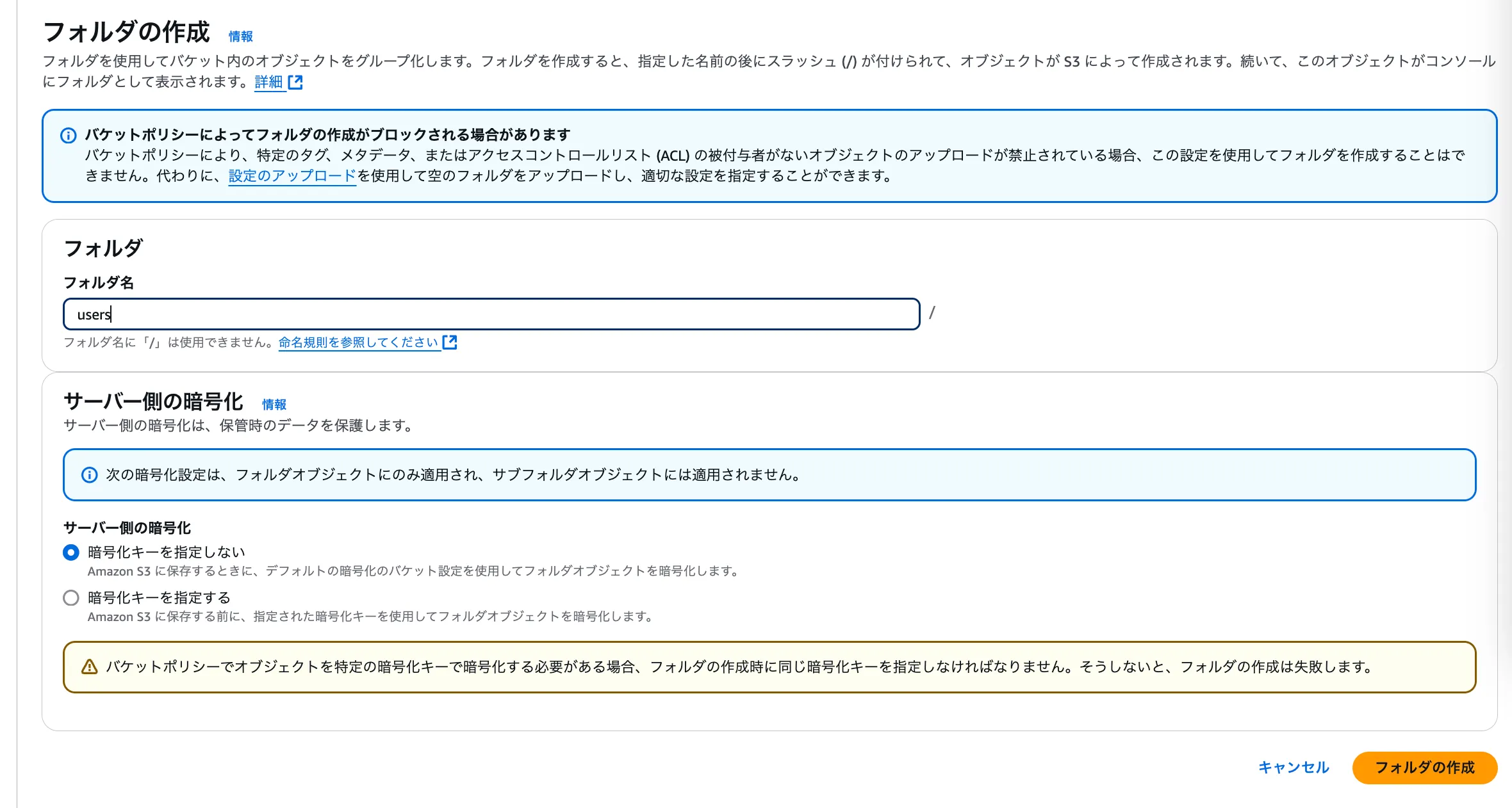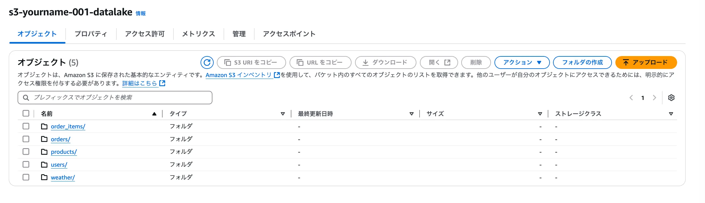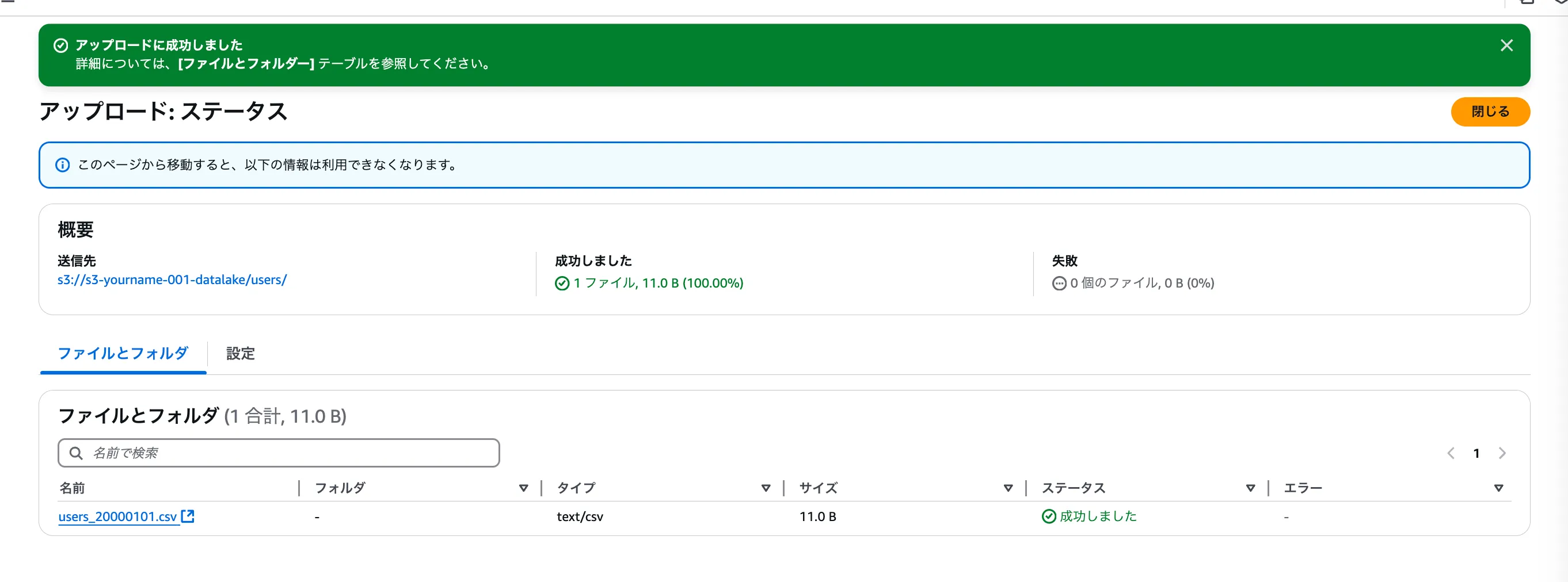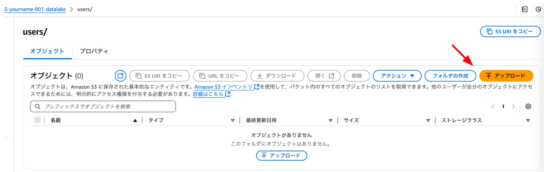 s3-[自分の名前]-[番号]-datalakeのusersフォルダに下記ファイルをアップロードする