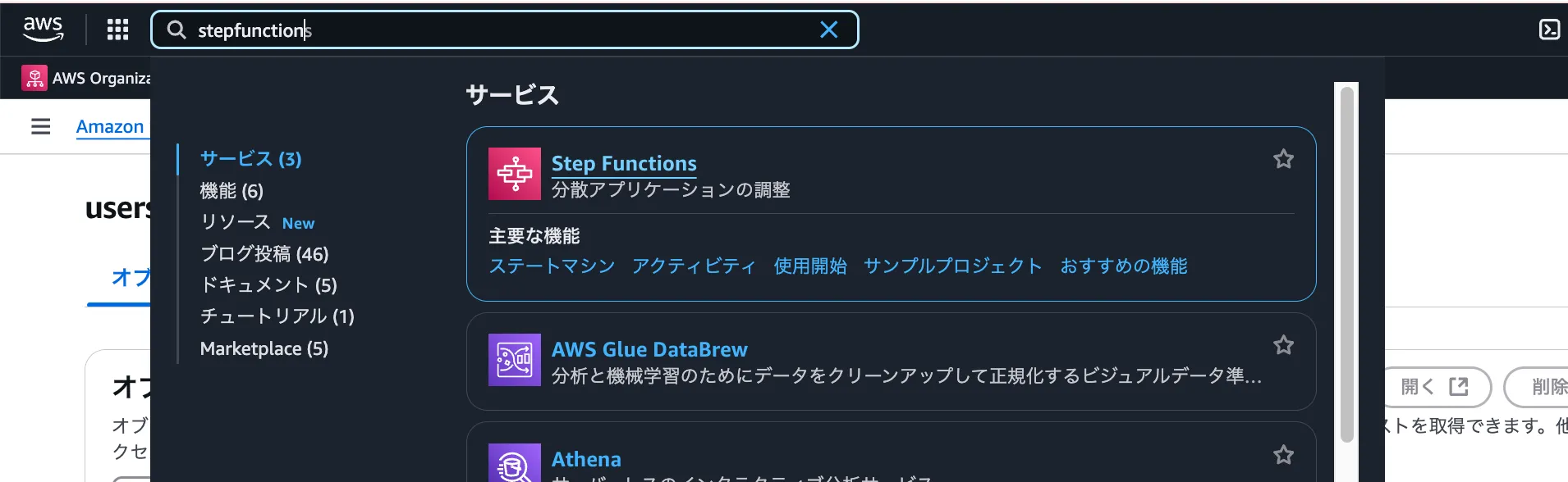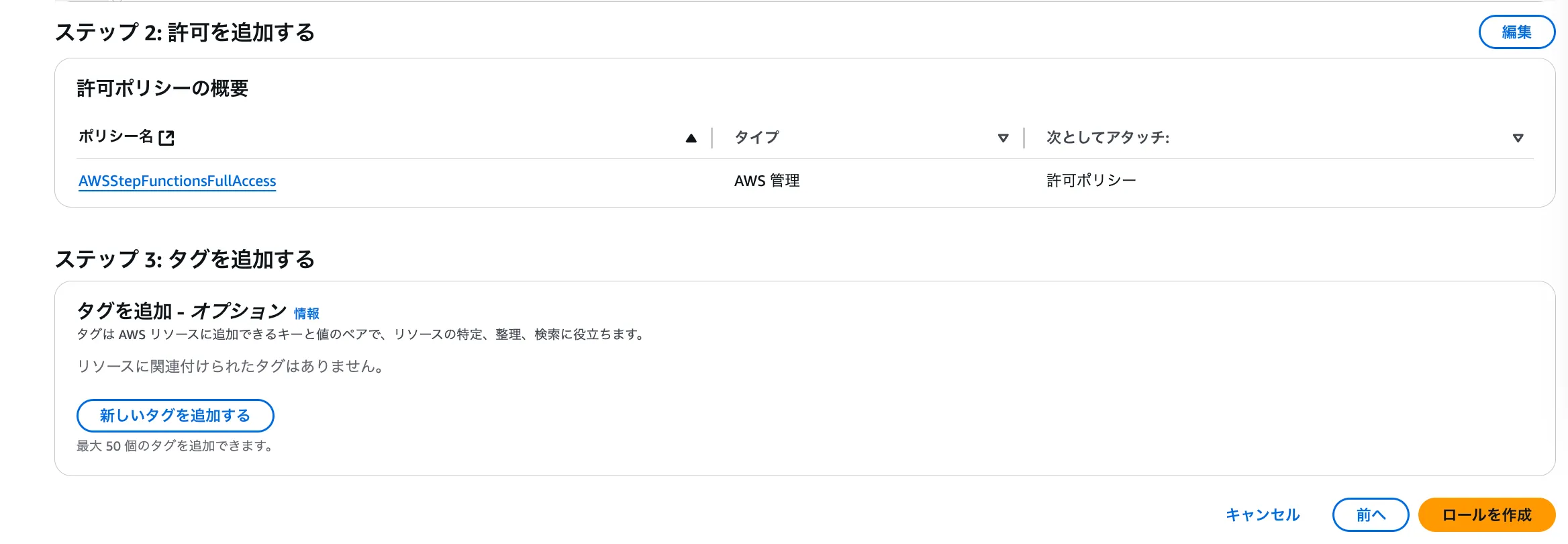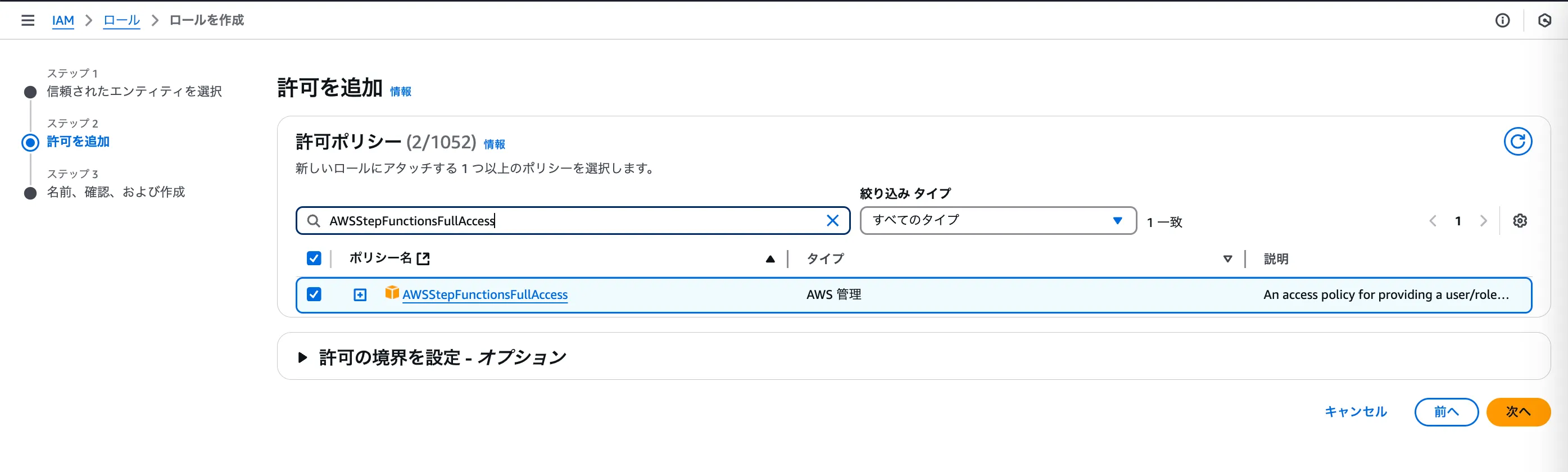 AWSStepFunctionsFullAccessにチェックを入れて次へ