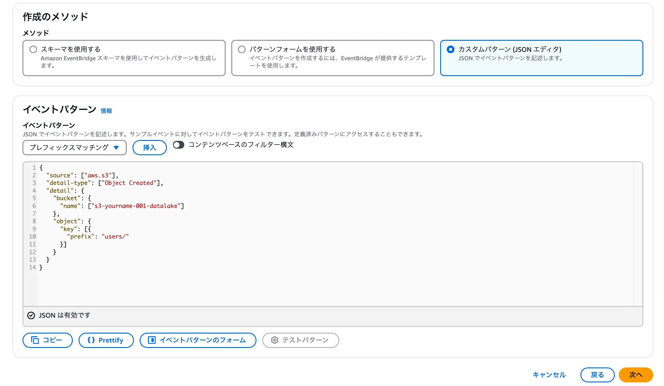 "name": ["s3-[自分の名前]-[番号]-datalake"]