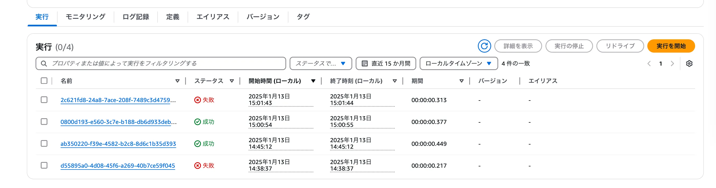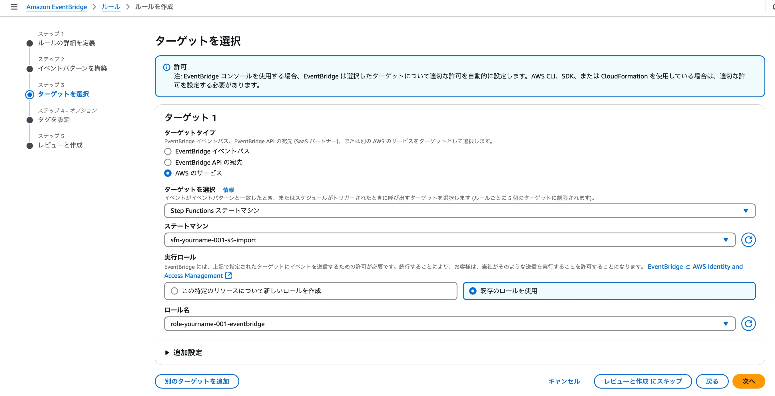 実行ロール: 既存のロールを使用を選択しrole-[自分の名前]-[番号]-eventbridge