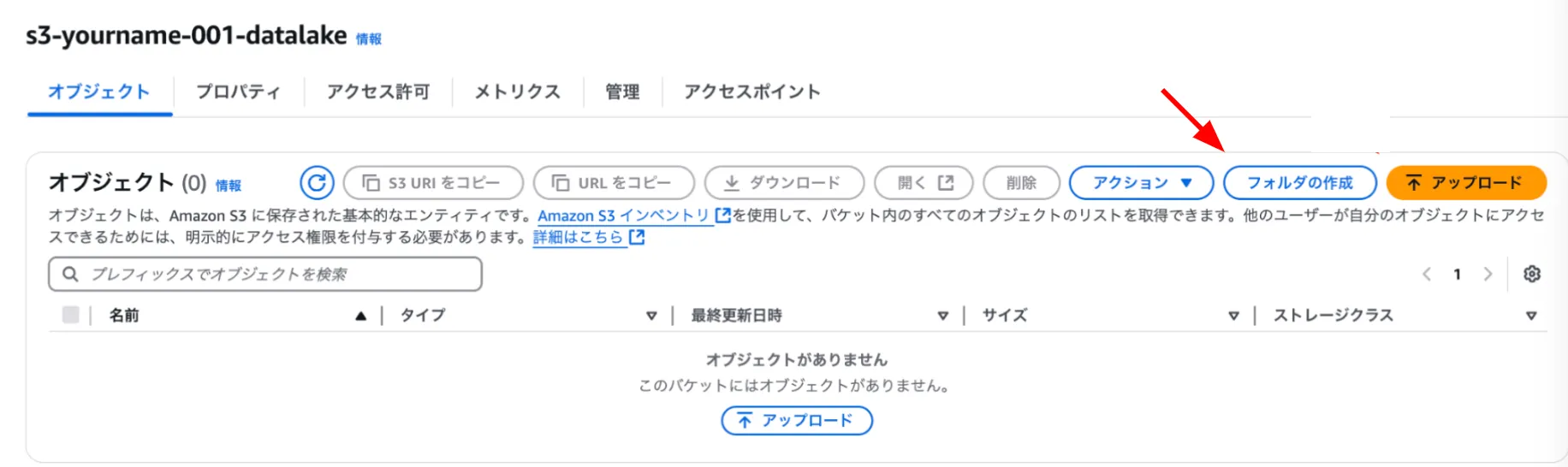 s3-[自分の名前]-[番号]-datalakeを選択し、フォルダを作成