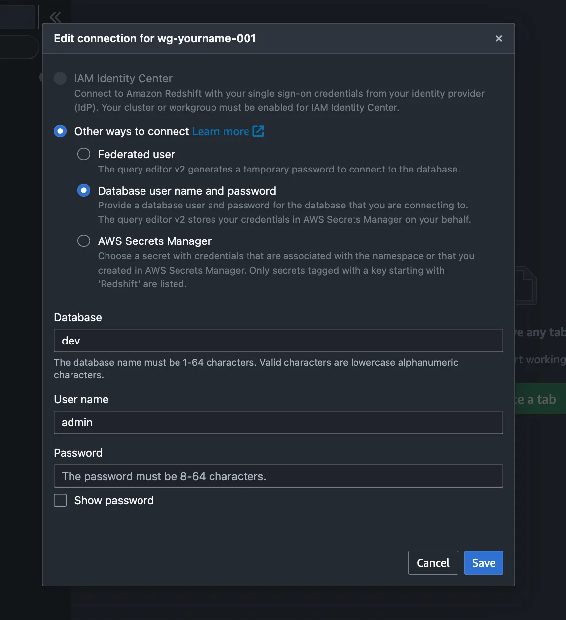 Database user name and passwordを選択し、ユーザー名とパスワードを入力する。