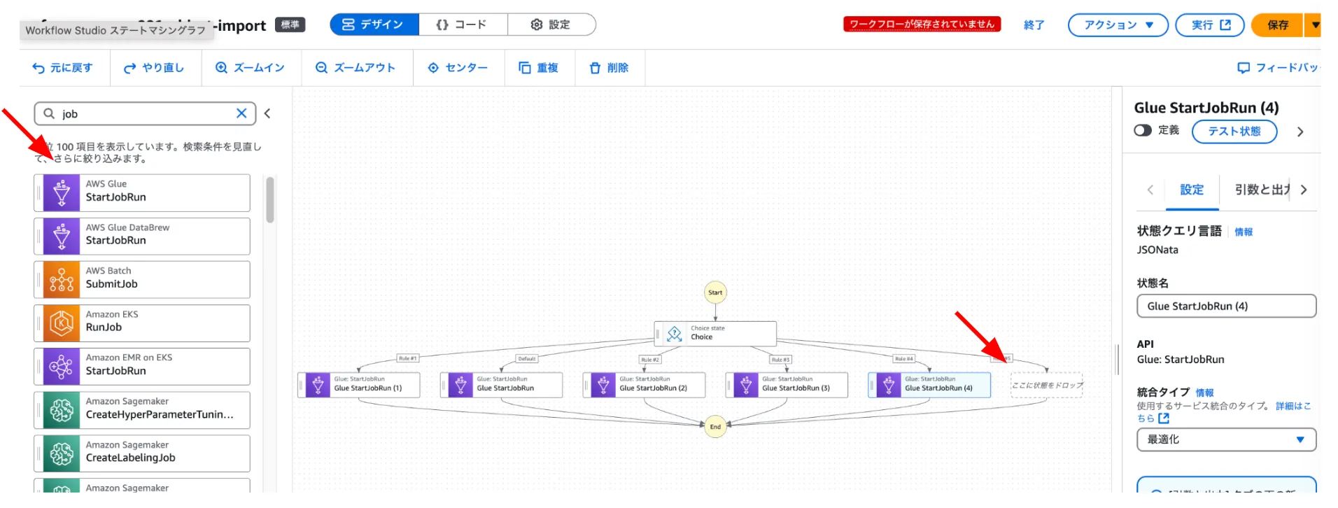StartJobRunステートを選択して「ここに状態をドロップ」の場所にドラッグ&ドロップ
