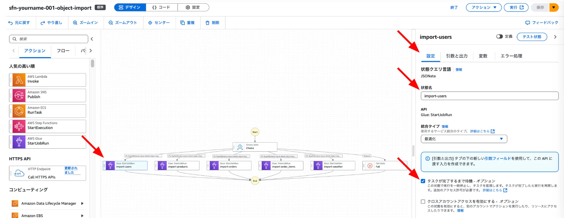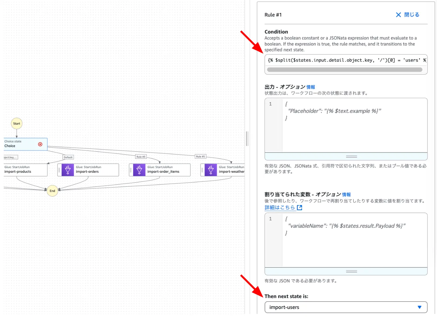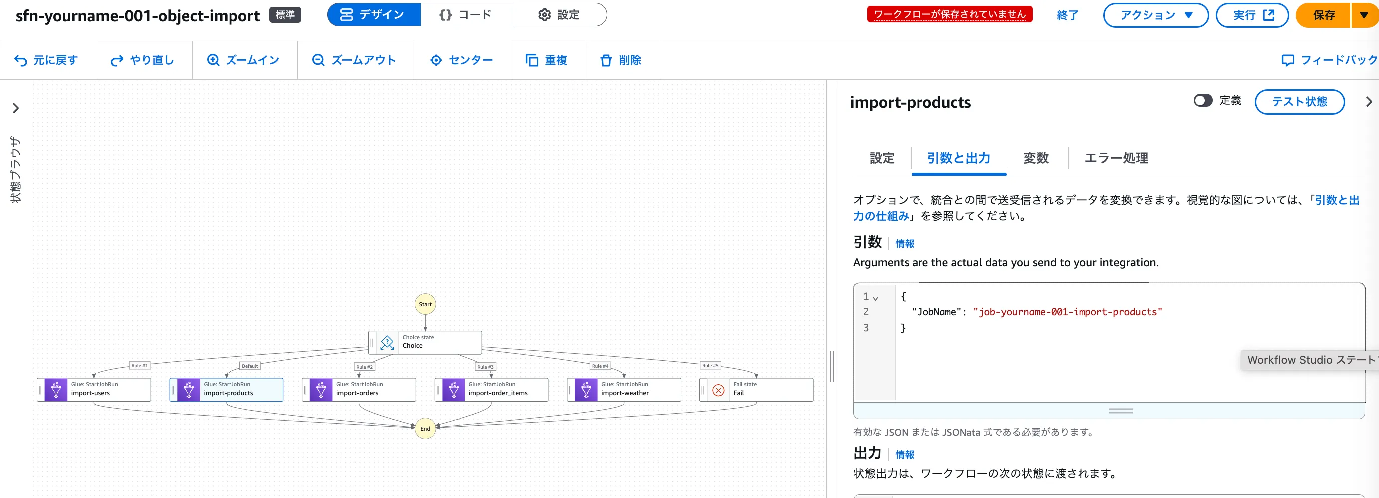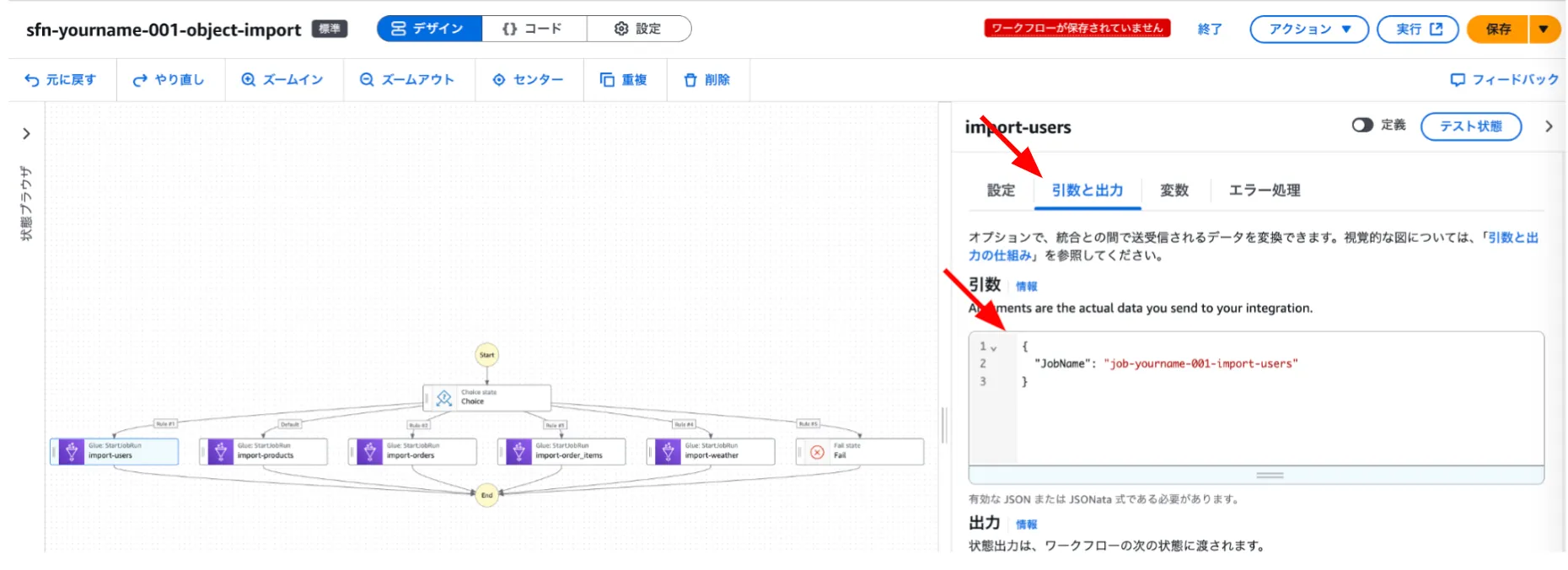 StartJobRun ステートの引数と出力より、引数を編集