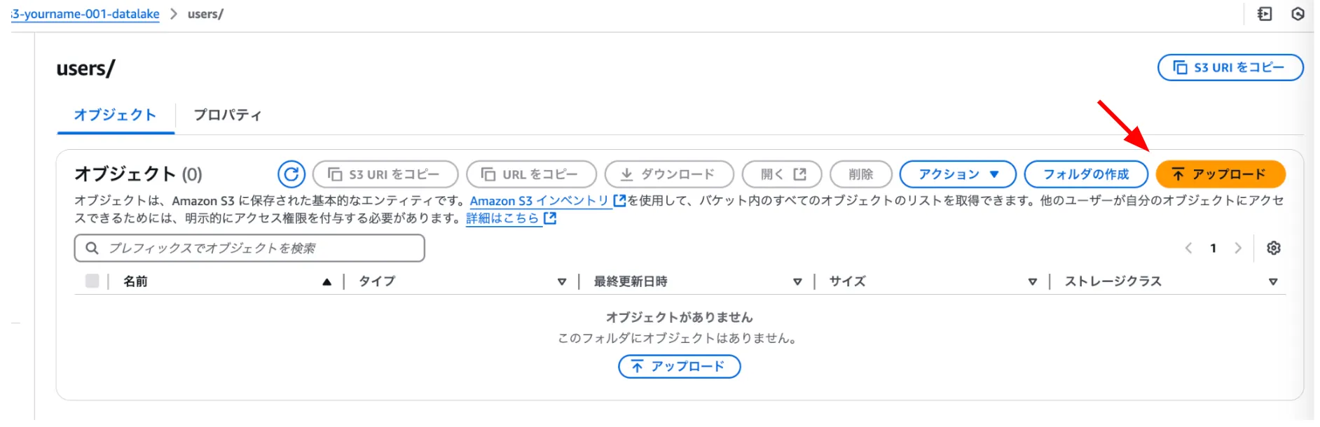 s3-[自分の名前]-[番号]-datalakeのusersフォルダに下記ファイルをアップロードする