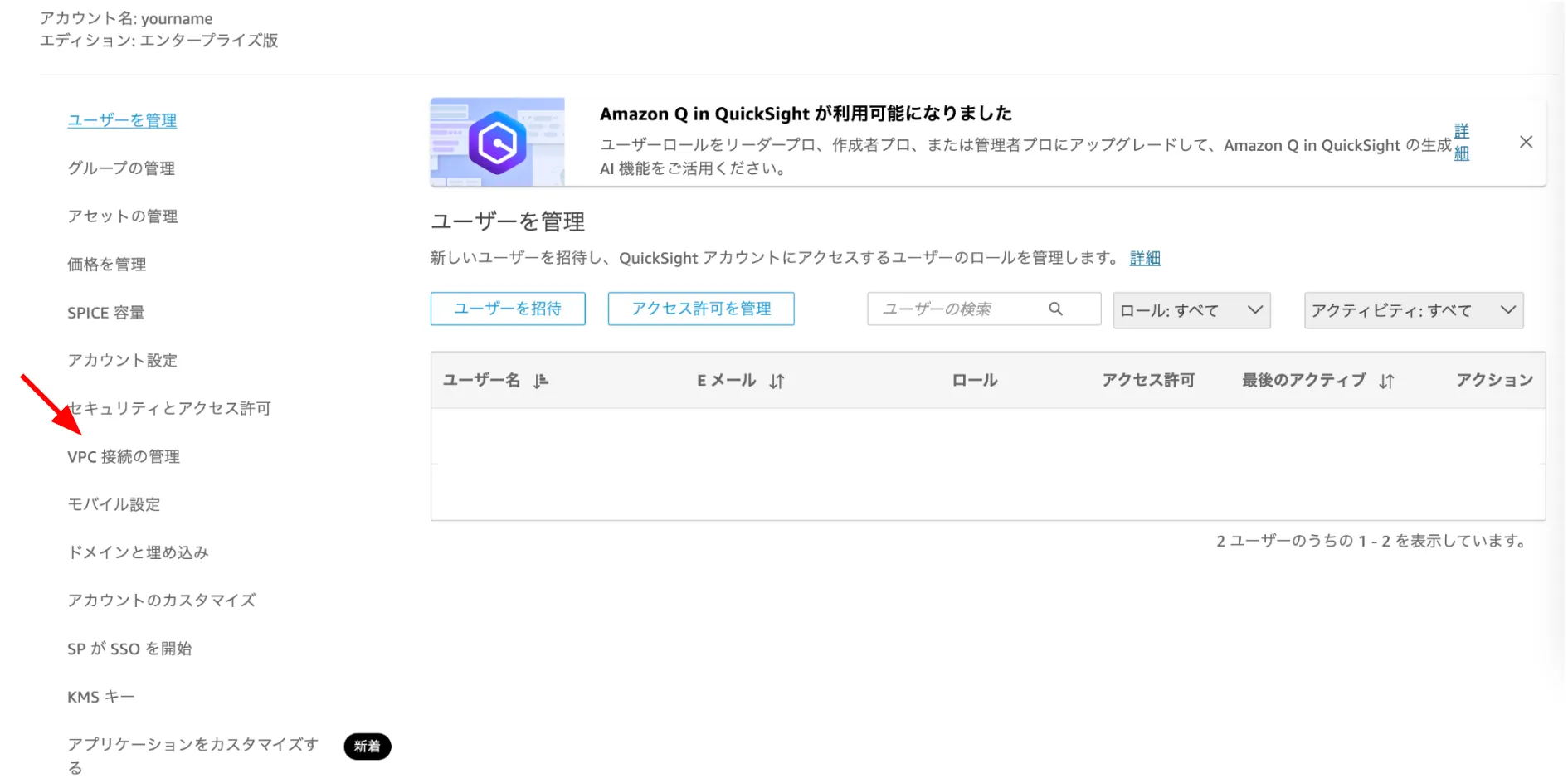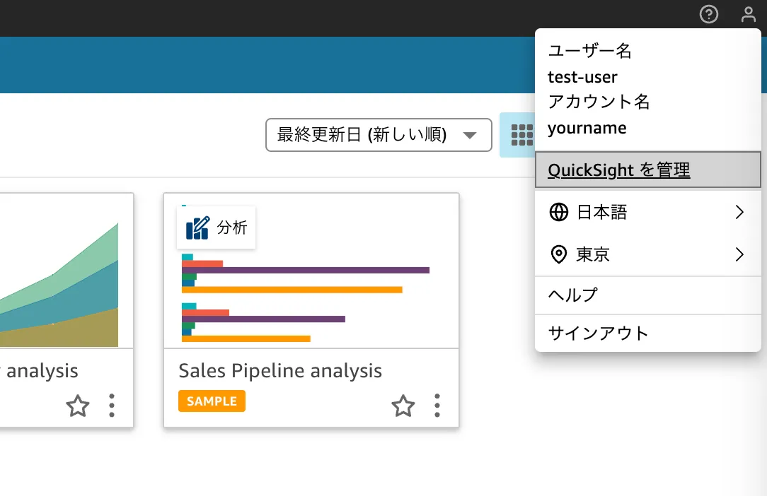 ユーザーアイコンをクリックし、QuickSightを管理をクリック