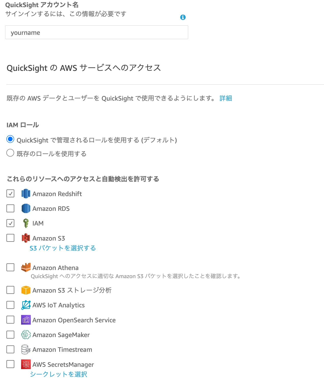 QuickSight で管理されるロールを使用する (デフォルト) - これらのリソースへのアクセスと自動検出を許可する: