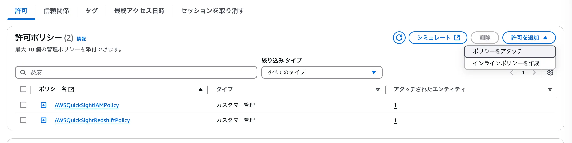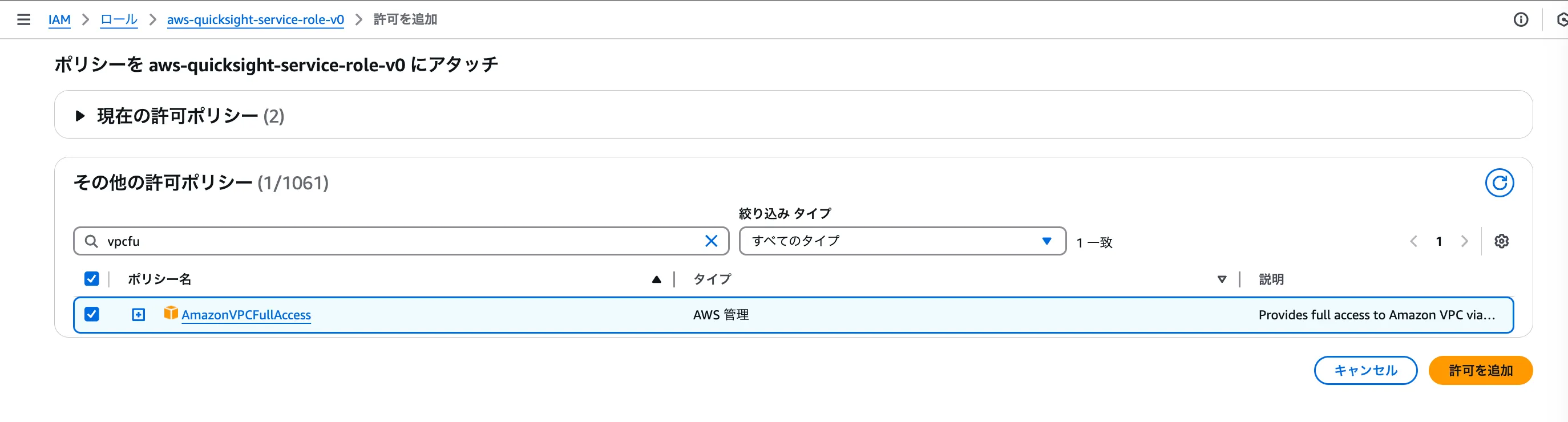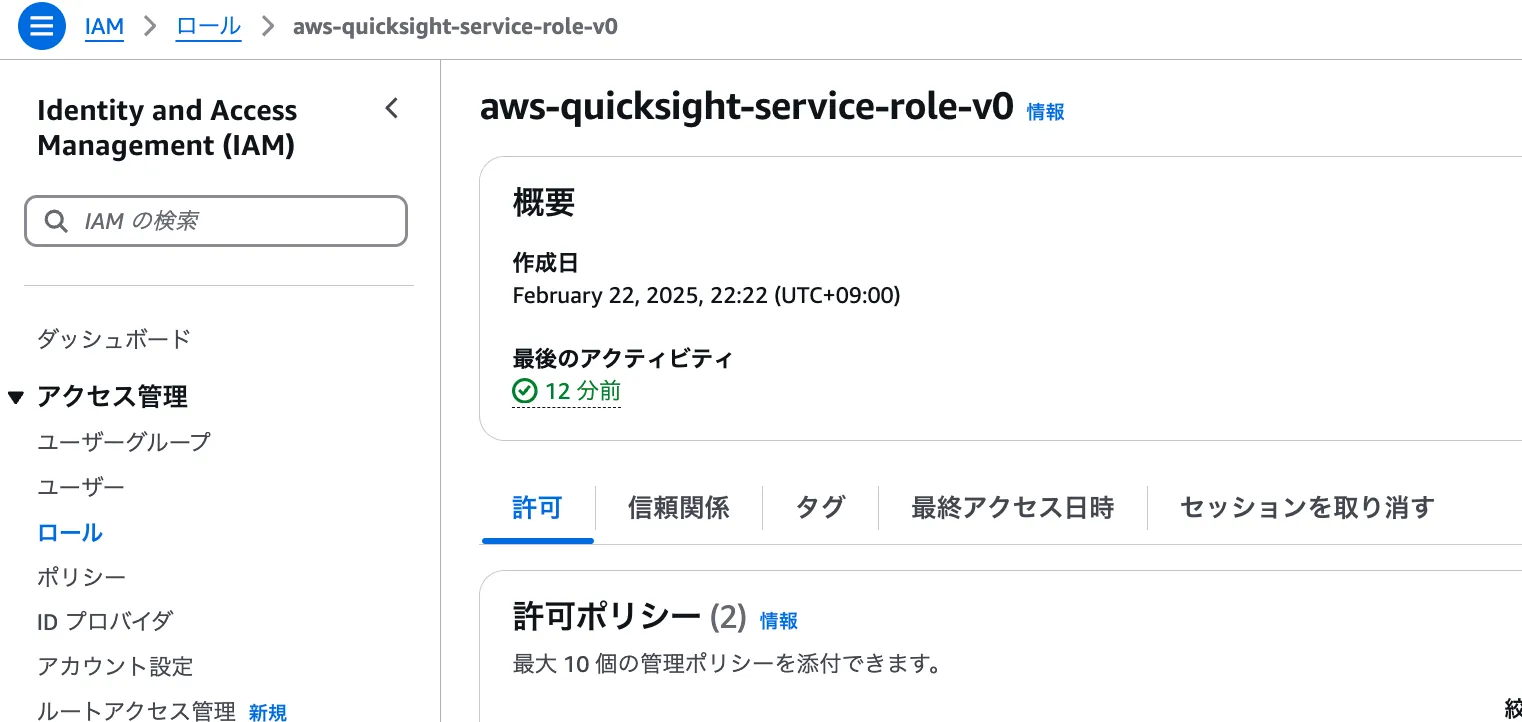 QuickSight用のロール(aws-quicksight-service-role-vNN)を開く